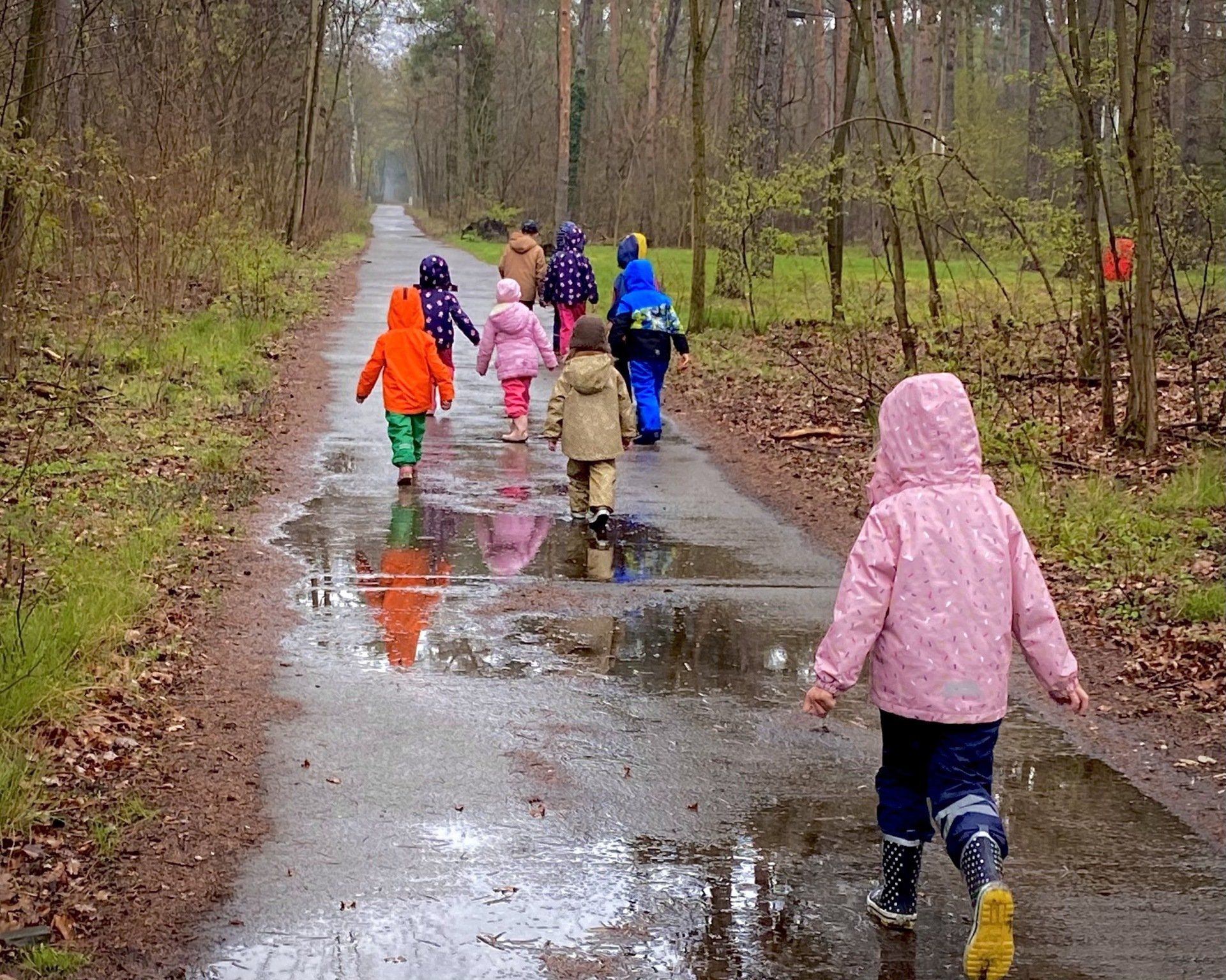 Bei Regenwetter nutzen wir die Gelegenheit zum Pfützen springen oder Blätter und Pilze zu sammeln.